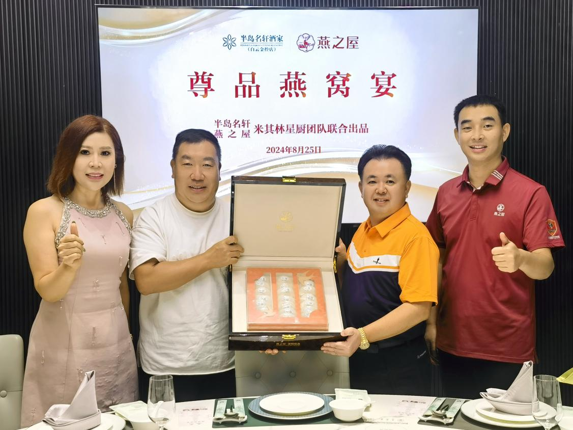 《米其林指南》是世界權(quán)威的美食指南之一,被評為米其林餐廳意味著卓越的品質(zhì)和服務(wù)。尊品燕窩宴菜單由半島名軒酒家(白云金控店)米其林星廚團(tuán)隊(duì)匠心定制,從食材到烹飪,從擺盤到成型,星廚嚴(yán)格把控細(xì)節(jié),意在為高品位人士帶來絕妙的美食盛宴。尊品燕窩宴以燕窩為媒,輔以時(shí)令食材,天然珍饈與粵式海味相得益彰,完美呈現(xiàn)中式滋補(bǔ)魅力,讓綿延千年*的中式滋補(bǔ)文化璀璨綻放(*“早在唐代我國就已用瓷器與北婆羅洲大尼亞巖洞所產(chǎn)的燕窩進(jìn)行物對物的交換,交換品也成為了宮廷的御用珍品。”《藥物與人》August 2000(Vol13)P349)。當(dāng)天,前菜-山莓戀燕,湯品-荷塘燕影,主菜-比翼雙飛燕、5J腿蓉燕窩扒雙蔬、陳皮燕窩和牛,主食-燕窩燒賣皇、桶仔燕窩撻,甜品-香檸杏汁官燕撈陸續(xù)上桌,組成一席金秋尊品燕窩宴,為在場人員帶來多重感官享受的用餐體驗(yàn),收獲在場人員的一致好評。