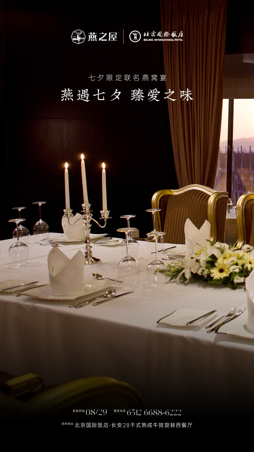 北京國際飯店長安28餐廳作為北京市中心高空360度環(huán)瞰京城盛景的旋轉(zhuǎn)餐廳,以其獨(dú)特的奢華與雅致并存的裝修風(fēng)格,成為京城高端餐飲場所。604㎡餐廳空間、100個(gè)精致餐位,3間多功能廳房,配合專業(yè)的服務(wù)團(tuán)隊(duì),為每位賓客提供尊貴的用餐體驗(yàn)。燕之屋27年專注高品質(zhì)燕窩,始終堅(jiān)持“源于天然,美與健康”的理念,以創(chuàng)新科研賦能上乘品質(zhì),連續(xù)九年高端燕窩全國銷售第一①。此次合作是云端視野與輕奢品味的雙重尊享,正如每一對(duì)相約七夕的甜蜜愛侶。